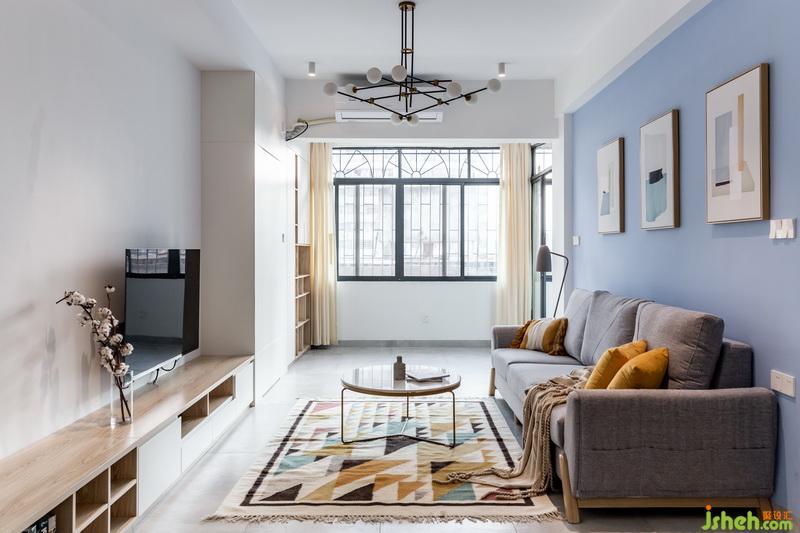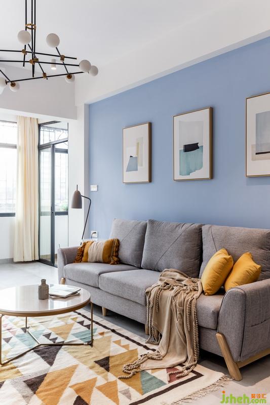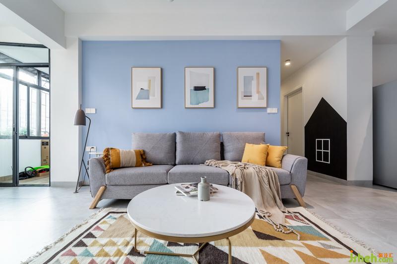 沙发背后那一抹蓝色,跳跃起整个空间,灵动而有魅力。电视背景和房门在同一平面,房门采用隐型门设计,使有型藏于无形之中。