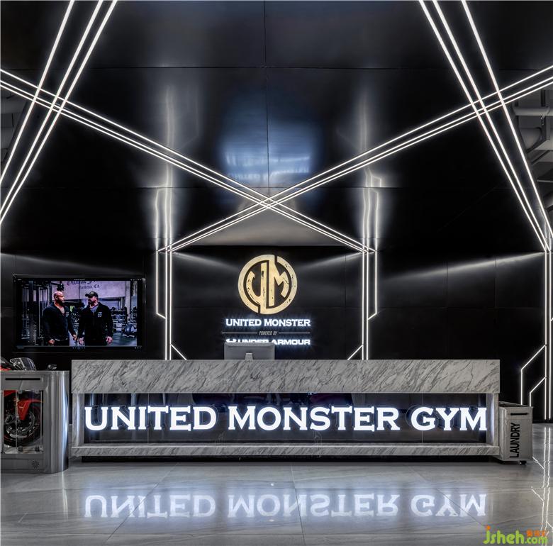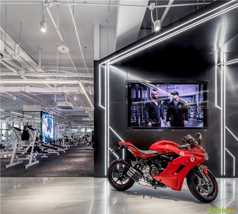 黑色的背景墙面,规则有序地镶嵌着线性灯条。顶面与墙面合二为一,不规则的造型,穿插延伸。红色的摩托,在黑色的空间里“飞扬跋扈”。