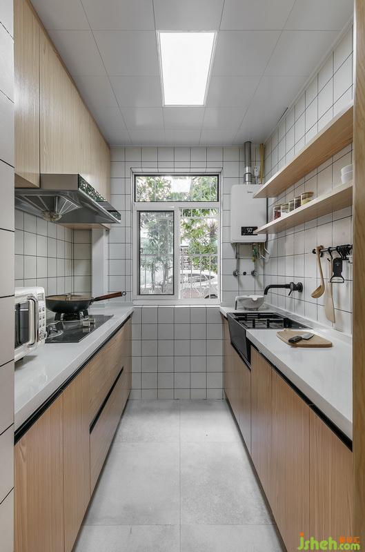 室内设计师改造后的厨房重新规划了厨房洗切烧的黄金位置, 增加吊柜来增加小空间的收纳,将油烟机藏进吊柜中,小空间中线条保持一致,干净利落、井然有序。