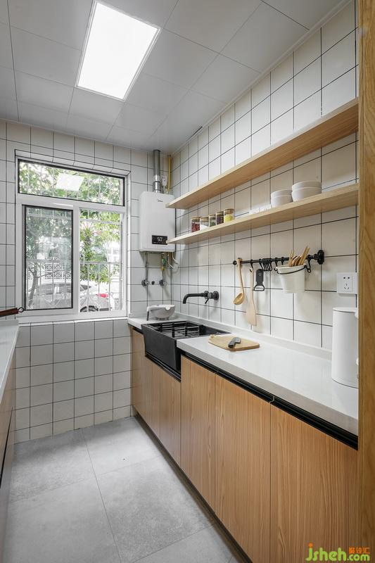 为了增大厨房的活动空间,我们做了40公分的操作台面内嵌水槽,开放式的层板置放的碟碗调味品方便拿取,墙面的挂钩也能满足日常的小件收纳,收纳分类好,再小的厨房也能安排的井井有条。