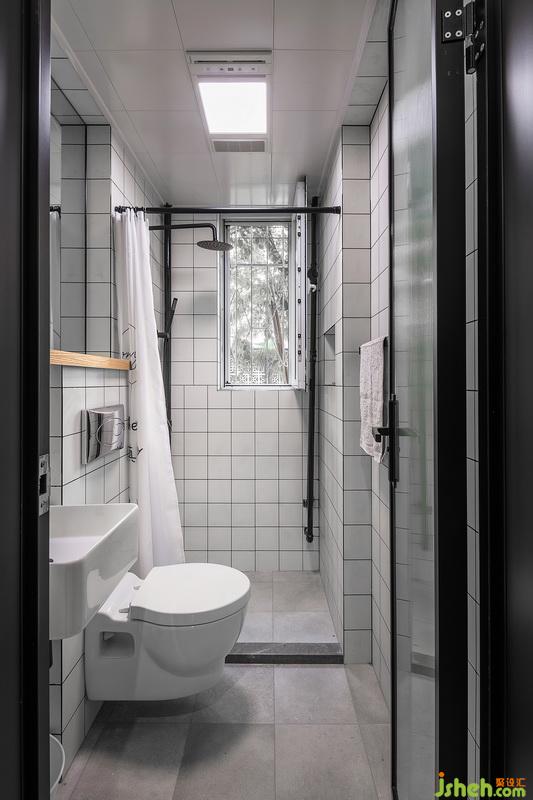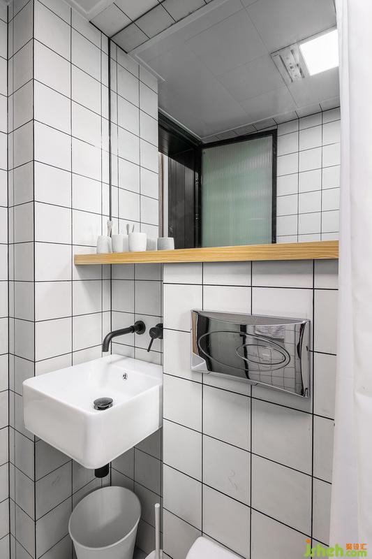室内设计师改造后的卫生间从原始的无处安放的卫浴洁具到安排的妥妥当当的面盆,壁挂马桶,以及淋浴区的过程中都是设计师抠出来的尺寸,在用钢架加固的情况下,设计师借用了墙体的尺寸来补给卫生间,淋浴区的壁龛的设计能承载大大小小的洗浴用品。