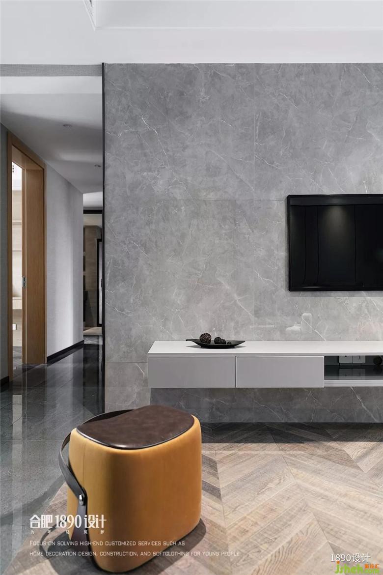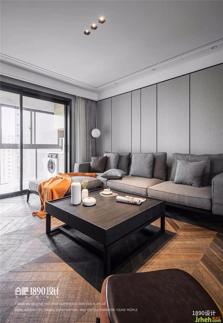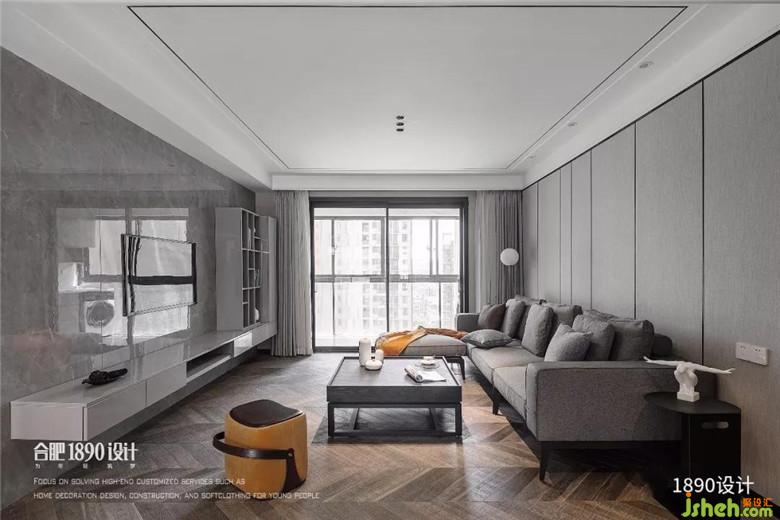 无主灯化的设计,让客厅空间简约时尚,电视背景组合柜,满足了平时展示与收纳,烟熏色的鱼骨拼地板,拉升了客厅高级轻奢感。