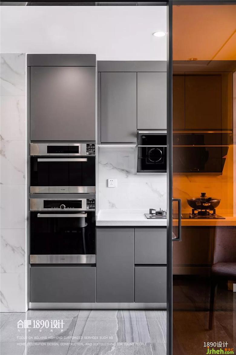 厨房橱柜装修公司采用高级灰色柜体与白色石材台面,搭配时尚的灰色地砖与爵士白瓷砖,相互呼应,相得益彰。
