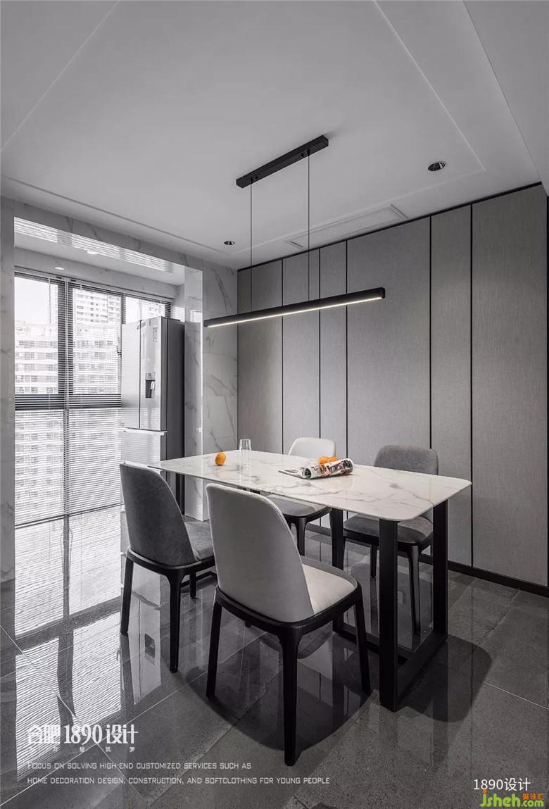 高级灰的布墙布系统,不同分割的金属线条点缀,提升空间的耐看度与品质感,极简的餐厅吊灯,聚焦视线,让空间更有层次。