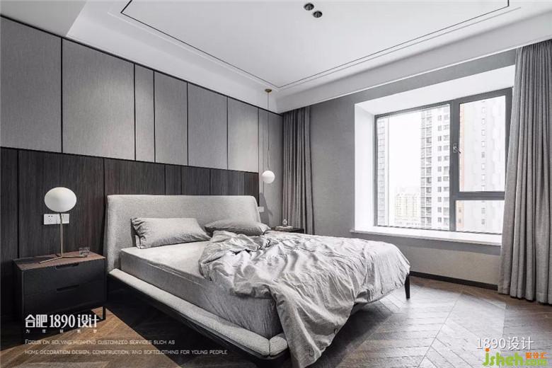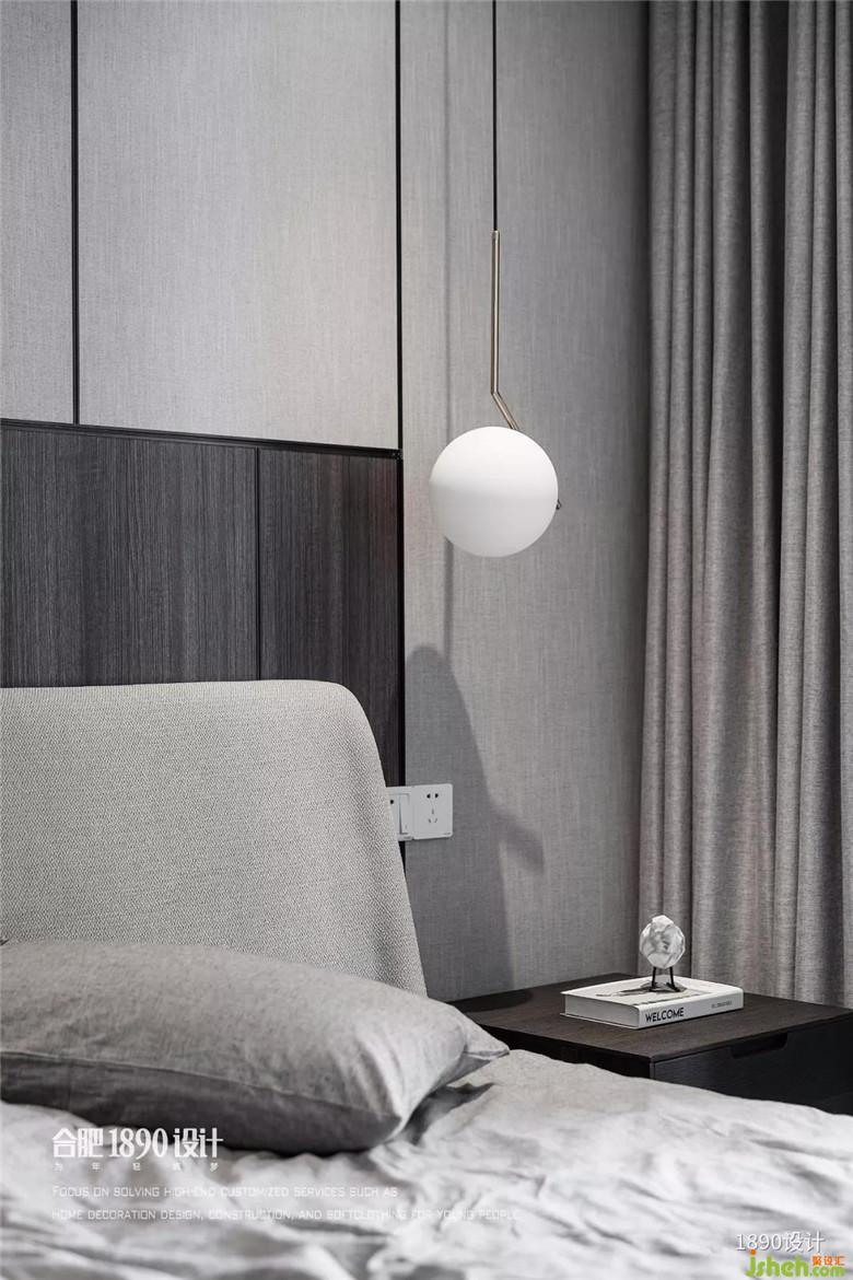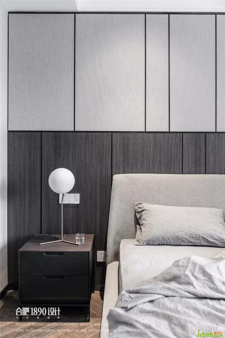 卧室整体风格延续了公区一致格调,高级灰的色调下,让空间气质十足,不同造型分割的布墙布系统背景墙为空间增添一份稳重,阳光倾泻下来的午后,让卧室更为温馨。