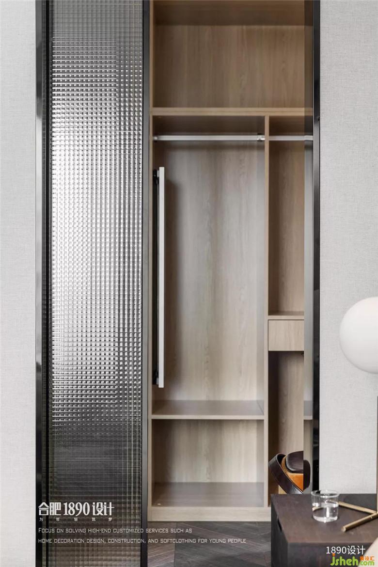 长虹玻璃的内嵌移门拉开,内部则是衣帽间,满足女主人的衣物收纳与梳妆功能。