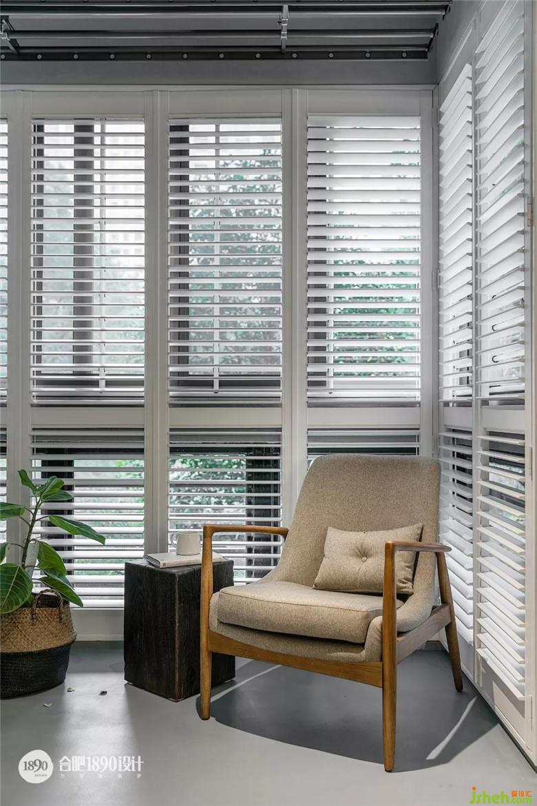 深色橡木木墩完美的搭配了单人椅,角落里的后现代金属三角灯,在白纱帘的照应下格外柔和。