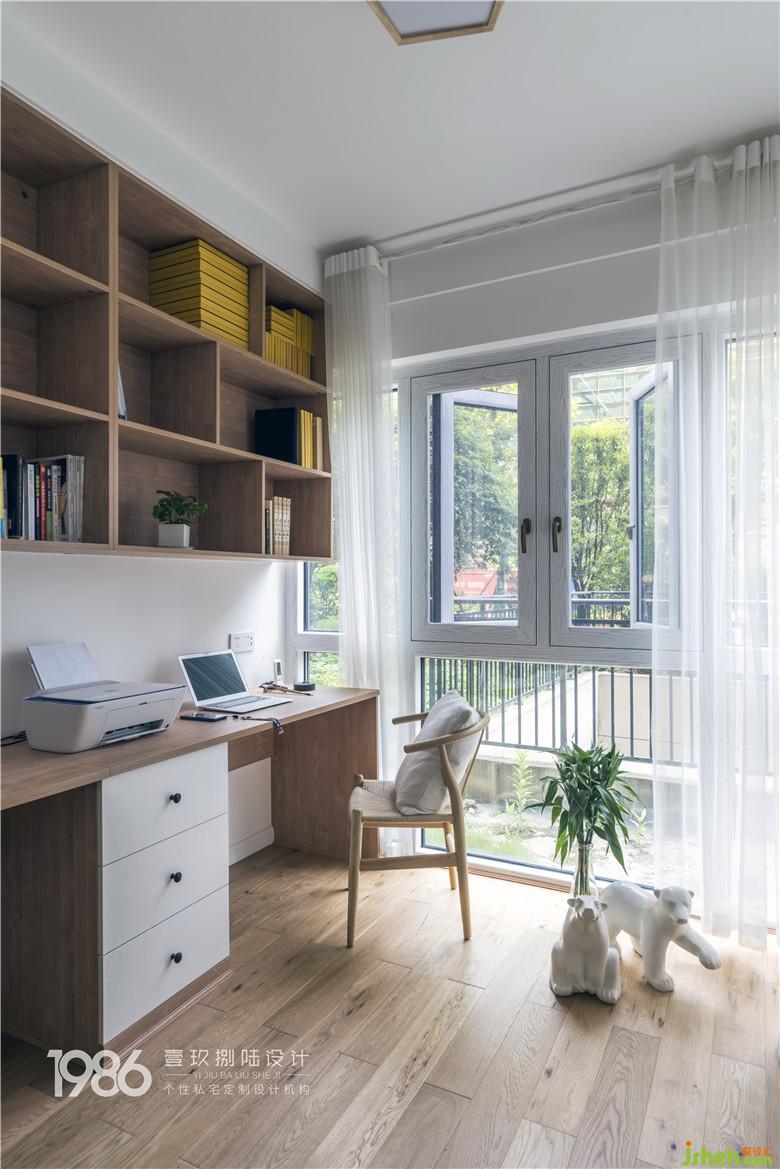 书房在布局时便将它与卧房区域分隔开来,在玄关旁边远离需要安静的睡眠区域,在这里主人可以安心学习和工作。为了让两位主人学习工作时不冲突,室内设计师给书房设计了两人位的书桌。