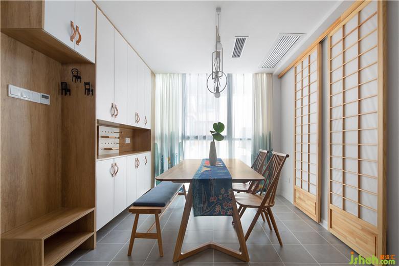 餐厅另一侧室内设计师根据空间需求放置合适的物体,墙壁用柜体填充,张弛有度。在收纳的功能上,还拥有鞋柜功能。