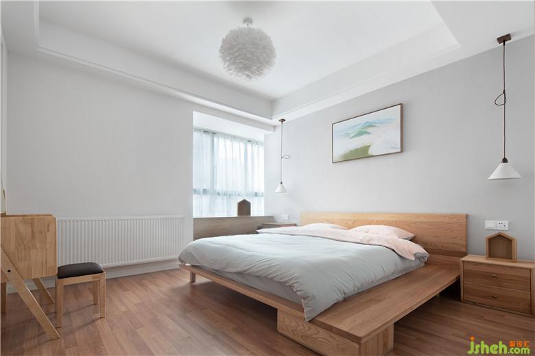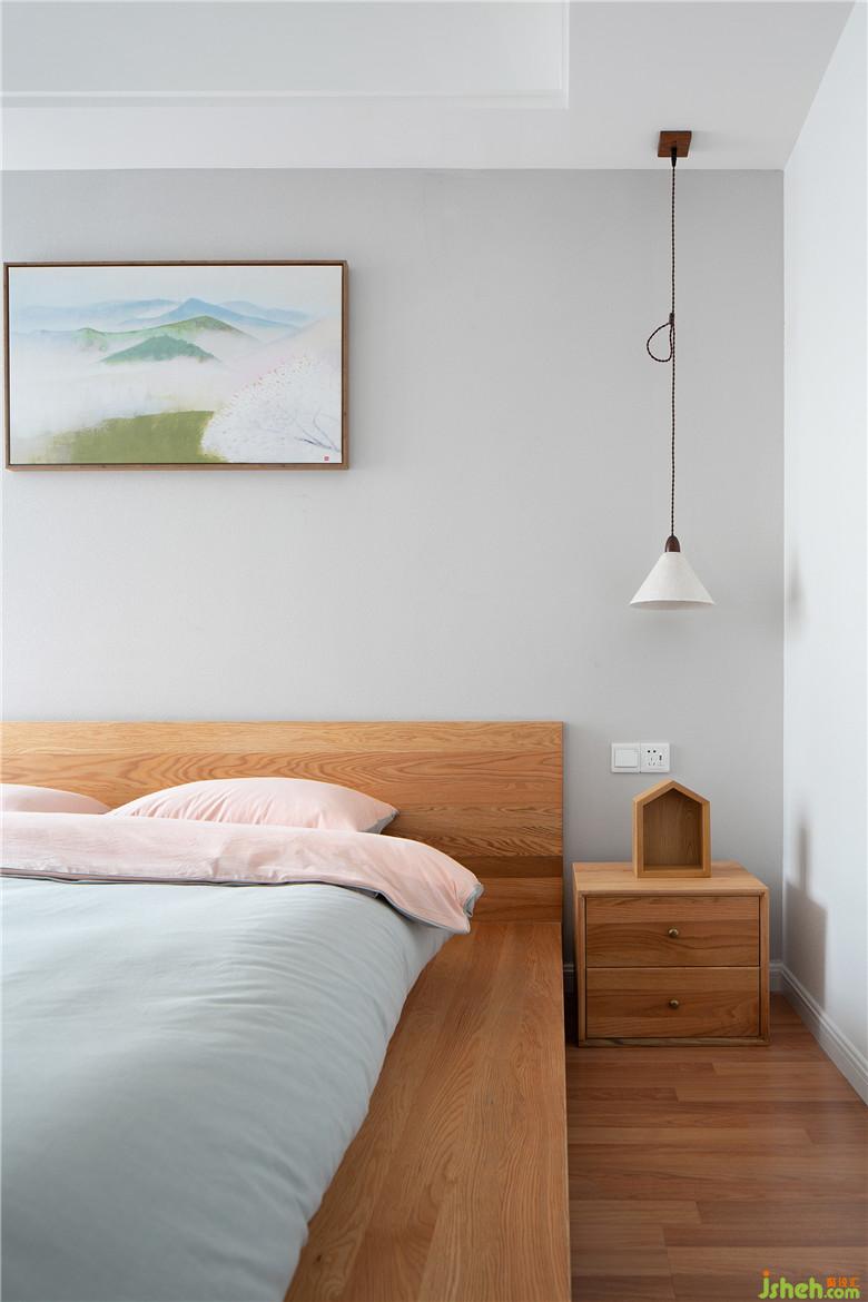 低重心的床让主卧空间更显开阔,轻盈的羽毛吊灯,简洁原木家具和两盏简单的床头灯,让肢体能得到最自然的舒展,告别沉重,给身心最好的休憩处所。