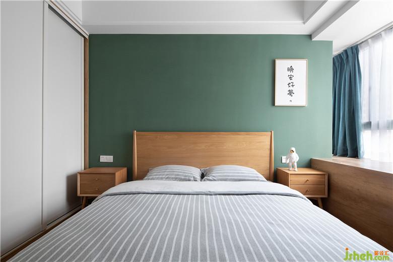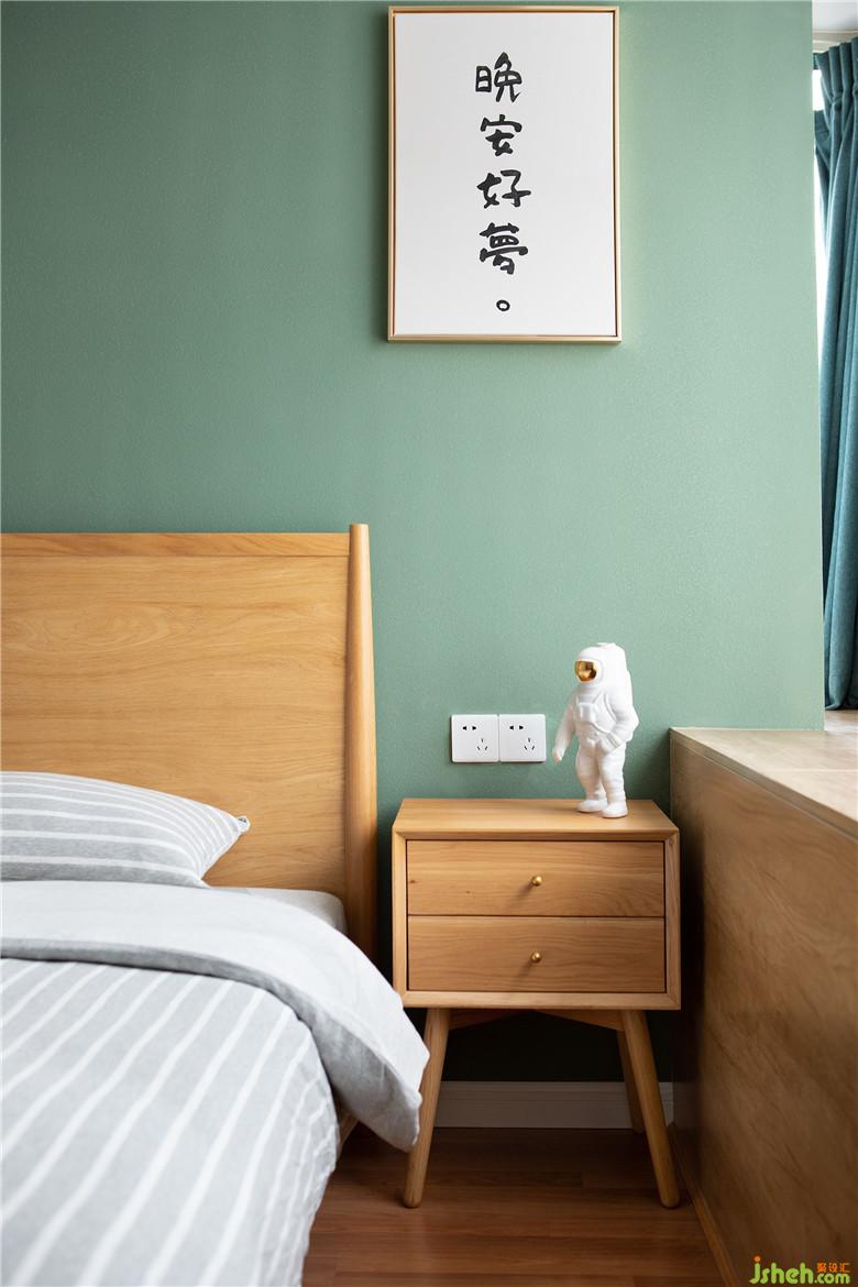 次卧白色的衣柜并没有让空间产生拥挤感,室内设计师简单的布局合理运用。床头墙面选用让人宁静舒缓的绿色,给予“晚安、好梦”最好的支持。