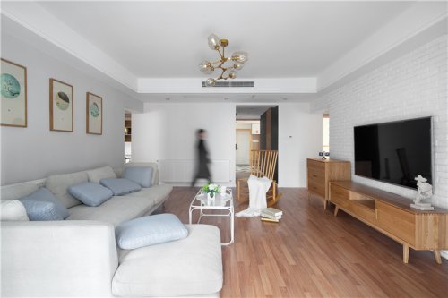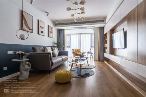 沙发背景墙是简单的线条墙板,超大的落地窗赋予空间充沛的阳光,加上线条的立体感,整体浅色调,装修公司让客厅格外通透明亮。