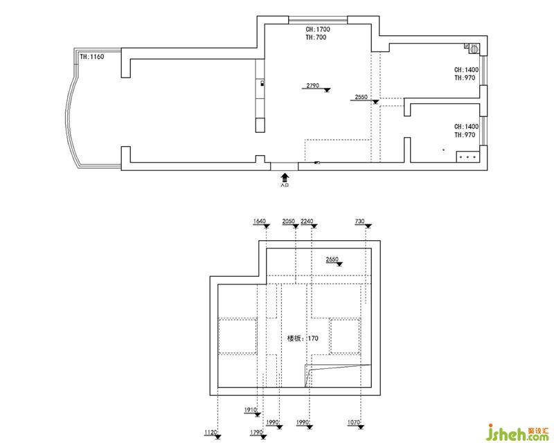 上海装修设计原始户型图 一楼45平,原始楼梯在进门右侧,进去之后比较压抑,客厅空间也不够完整,餐厅也没有好的位置放置,如果把玄关+楼梯+客厅+餐厅在现有房型空间结构上去设计很尴尬、拥簇。 阁楼本身就十几个平方有个斜顶,正常使用的空间很有限。