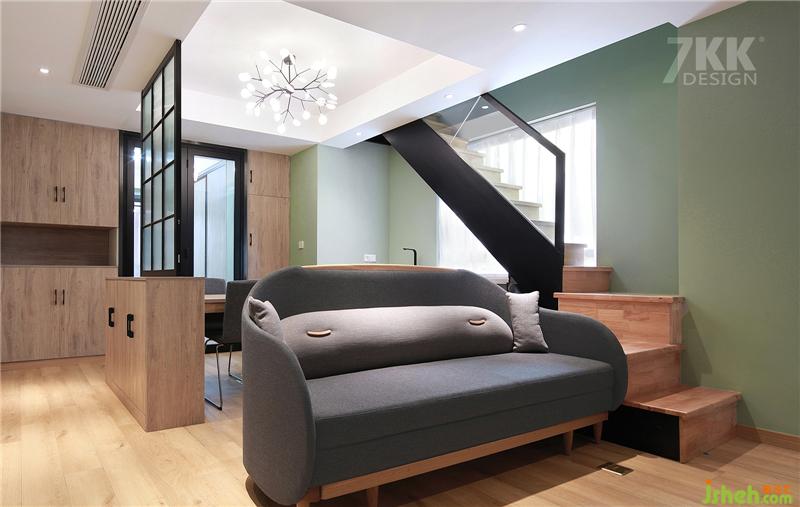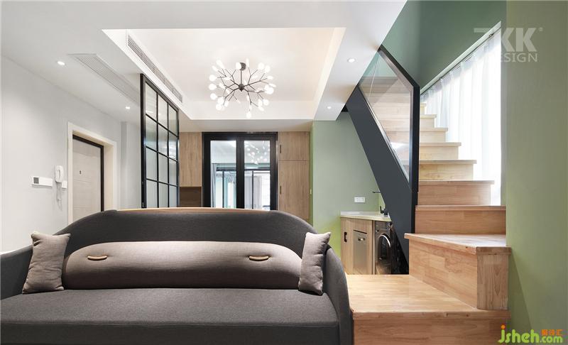 深灰色硬朗线条的楼梯扶手搭配暖色木质台阶,墙面大面积采用屋主比较喜欢的薄荷绿搭配,呈现一种清新温馨的居家环境。