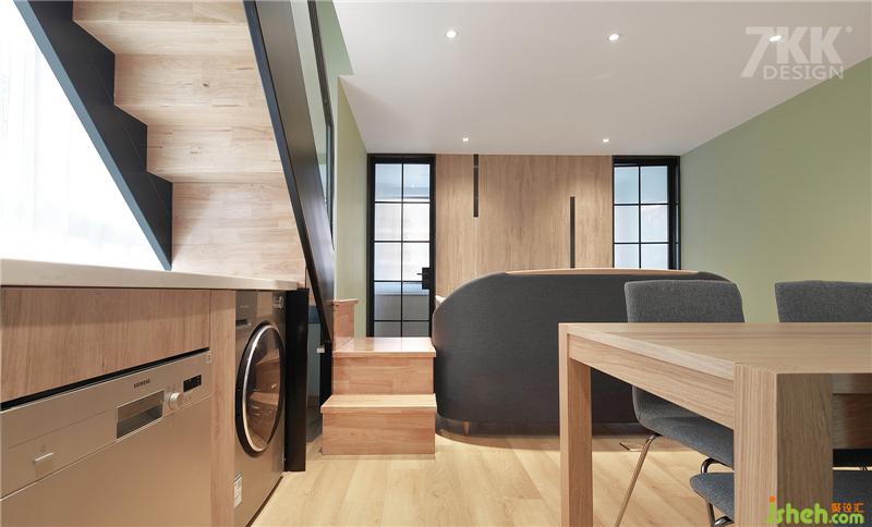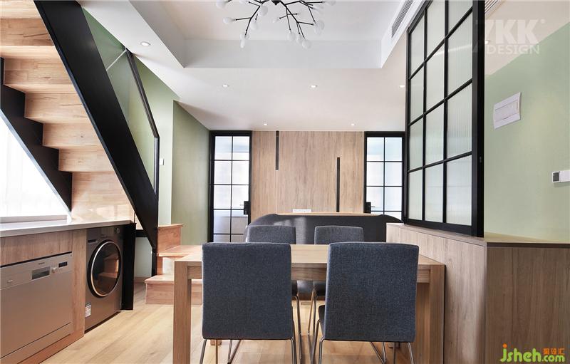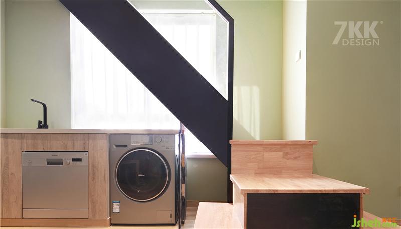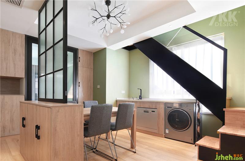楼梯经过巧妙的设计把阳台推出去利用阳台空间搭建楼梯,楼梯下面也是充分利用起来,靠墙做成吧台,下面嵌入电器烤箱,微波炉,洗衣机,收纳充足。 利用楼梯台阶把客餐厅的空间功能区域划分,空间视觉却又协调统一。