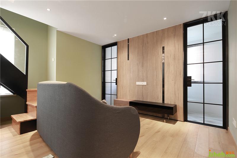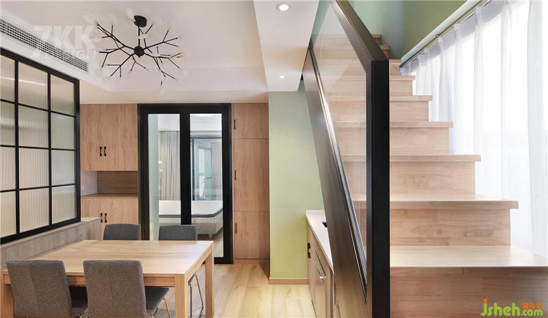 从餐厅看卧室,楼梯靠窗设计,也不影响光线进入餐客厅的空间。直对的卧室左右两边的柜体也是选用材质统一的色调,上海装修设计左边是收纳鞋柜,右边是嵌入式的冰箱柜,空间上整体一致,又有神秘感。主卧门采用黑色边框玻璃折叠门,不仅可以纳入光线,又节省空间,平时敞开式的空间通风效果也很不错哦,这卧室一侧还可以选择窗帘搭配,休息的时候又创造出独立的舒适睡眠环境。