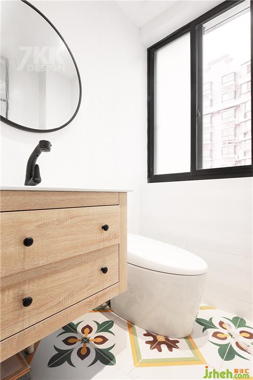 卫生间地砖也是采用清新的花纹拼接,圆形的艺术镜子,一个台盆柜一个马桶,小而精致的空间,淋浴和浴缸设置到了主卧阳台的空间。