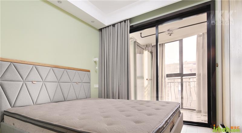 主卧,整体墙面和客餐厅采用统一的清新薄荷绿,上海装修设计黑色边框玻璃移门,浅灰色的窗帘搭配,打造优雅清新品质睡眠。