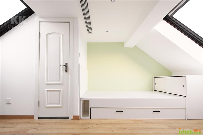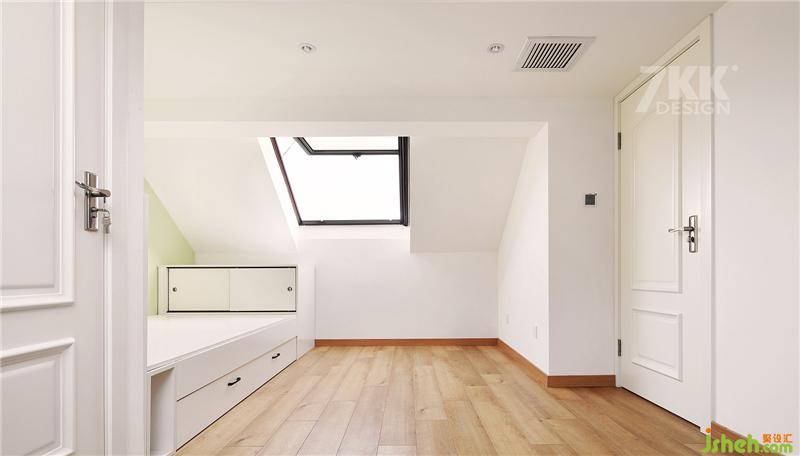 阁楼因为层高的原因,在空间利用率上也是定做为主,主要功能作为书房,客卧,还有卫生间的空间以后有小孩也可以作为小孩房。中间最高处做了卫生间的门,里面有淋浴马桶,色调以白色系为主。斜顶两边的老虎天窗光线很好哦。