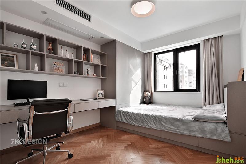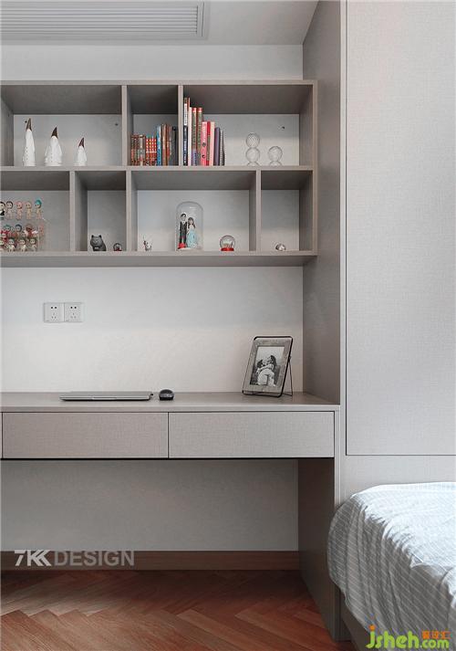 次卧将多功能做到淋淋尽致,多功能房书桌、衣柜、榻榻米、整体空间集学习、收纳、休息与一体设计。定制的收纳柜体,书柜连接式一体化上海装修设计,有藏有露,更具美观性。榻榻米有1.5m*2.43m高度有40公分,侧边抽屉可以拉出来使用,靠墙定制的衣柜是0.6m常规的衣柜宽度,增加收纳空间。