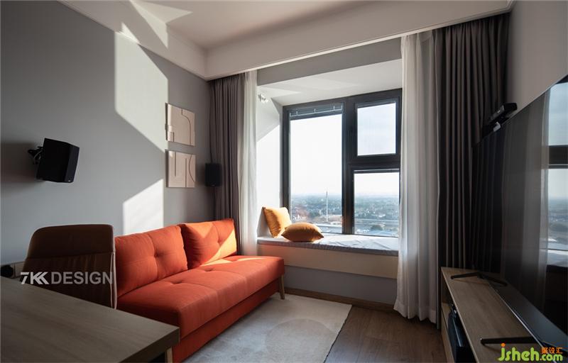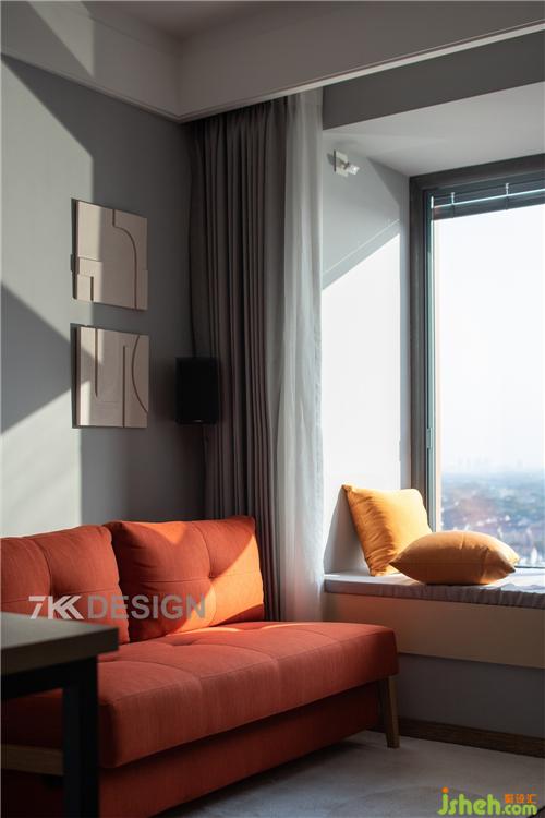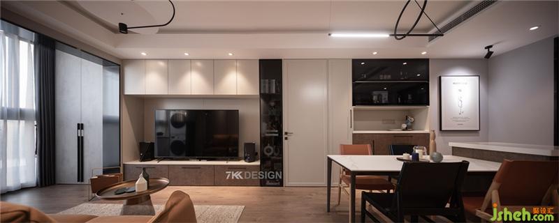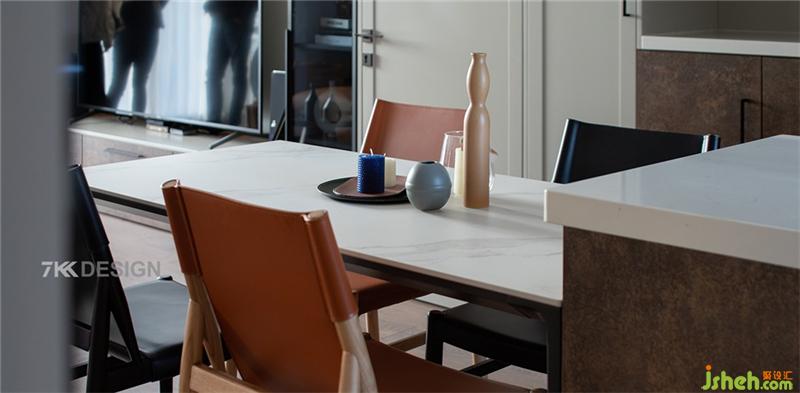 阳台储物柜、电视柜,隐形门,餐边柜一体链接设计,保持空间的统一性,上海装修设计使用不同的材质、造型丰富空间的层次感。黑色与橙色搭配的餐椅设计,为这个家融入了更多的精致细节,处处彰显着屋主对生活品质的追求。