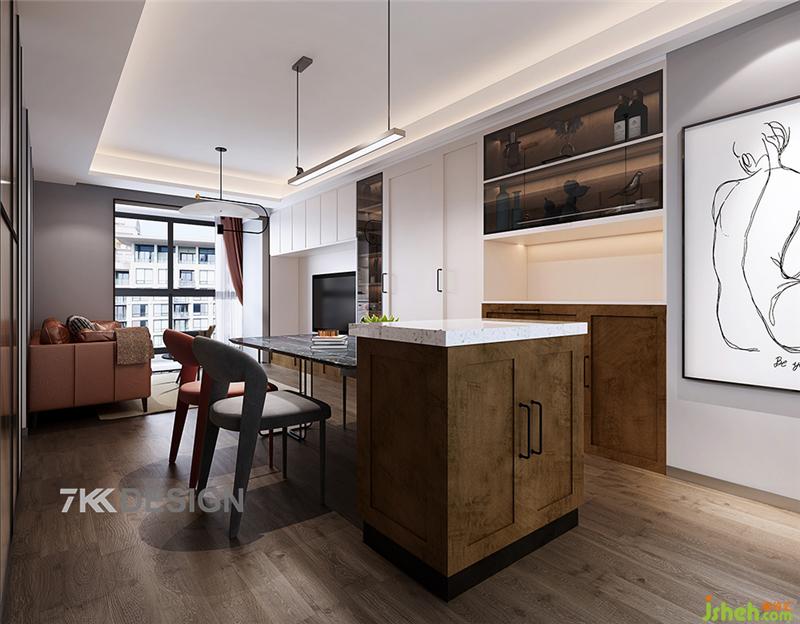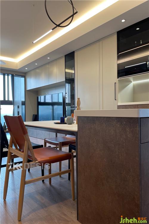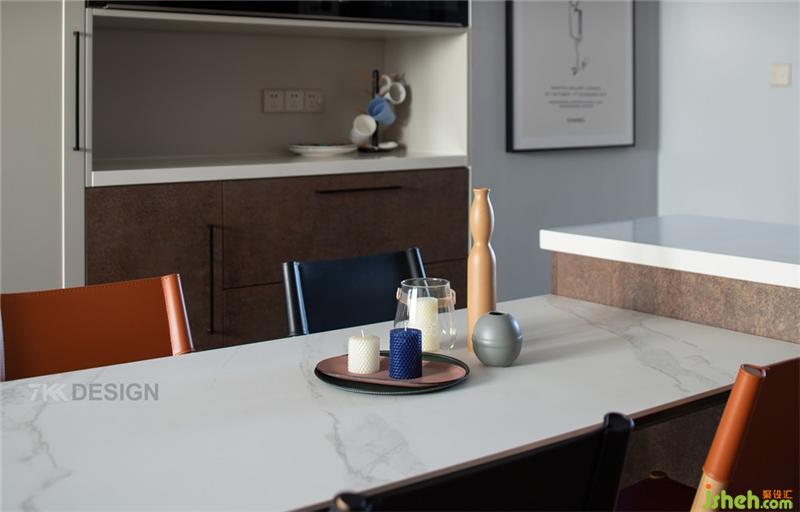 现在越来越多的家庭喜欢把厨房和餐厅成为家庭活动的中心,餐厅中岛台的设计,让全家可以围绕它来做烘培,连接家人感情,加深情感,同时又兼具收纳柜,吧台、备餐台的功能。