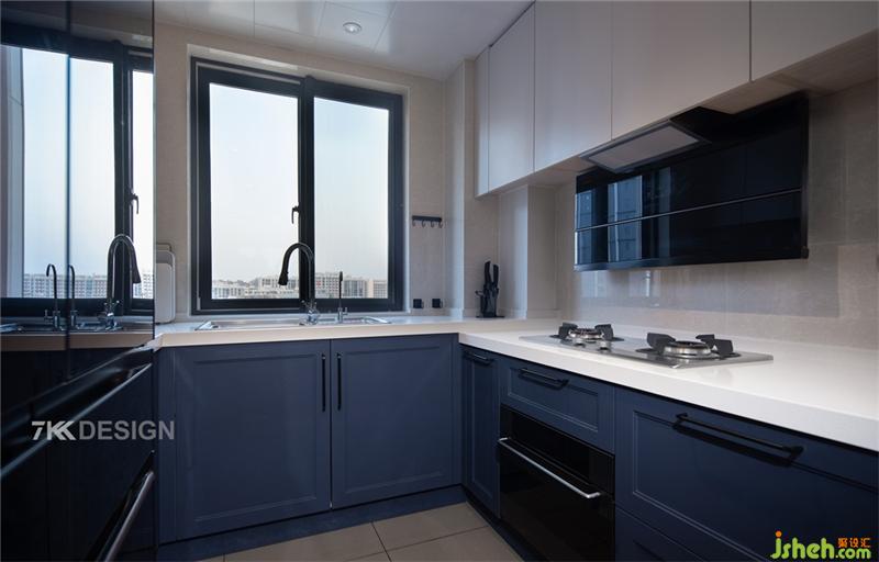 把原始厨房的橱柜面板拆除掉,替换了深蓝色的橱柜,在光线的晕染下营造出一份静谧与雅致。 厨房做玻璃移门设计,隔离油烟,方便人进出,还可以使家里的采光更好,更加通风。