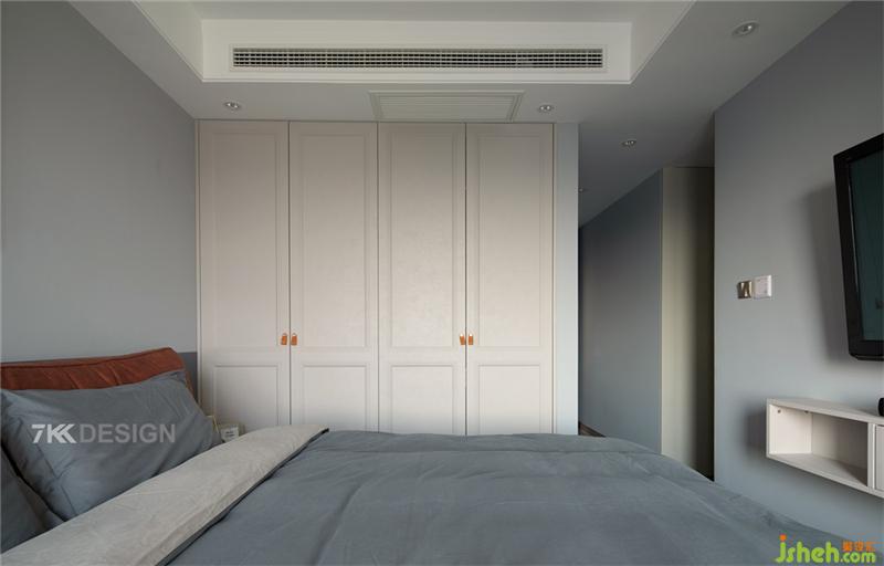 空间整体以浅灰色为基调,不同深浅的灰搭配局部橙色点缀,丰富空间层次感,不会显得单调乏味。上海装修设计重新布局卫生间后,还有足够的空间做一面顶天立地的定制衣柜,满足平常的衣物收纳。