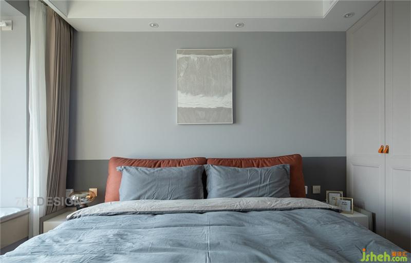 主卧作为整屋的唯一正式休息区。因此在设计上做减法,让空间保持呼吸感,整体装饰淡雅朴实,营造轻松舒适的睡眠环境。皮质的软包床头和浅灰色的床品搭配,温暖柔和,让空间视觉感达到最舒适的状态。