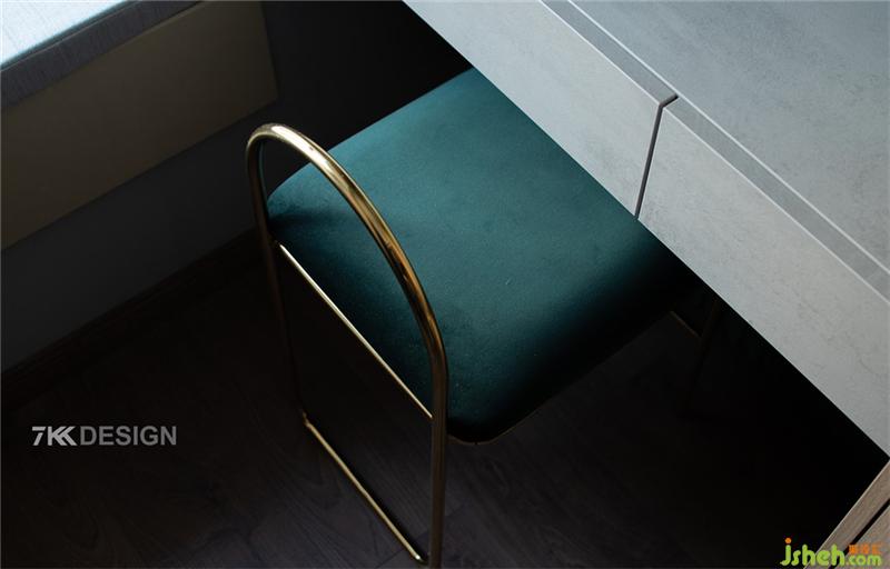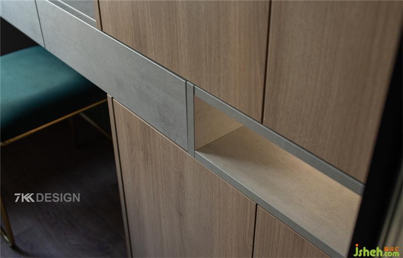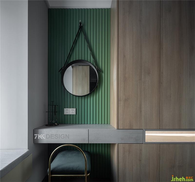 梳妆台的背景墙使用绿色木格栅设计,搭配原木色的定制衣柜给黑白灰基调的空间注入了自然的温度,让空间简约、静谧、舒适、颜值满满。