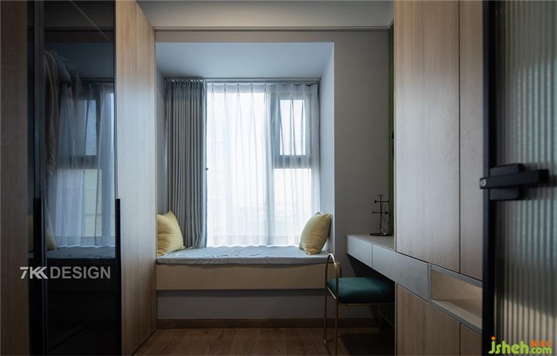 衣帽间和卫生间、主卧形成套间形式,不仅私密性强,使用功能也很完善,大大提升了业主的生活幸福感。 由于飘窗无法拆除,所以保留了飘窗台,闲暇之际还能在上面看书喝茶,好生惬意。