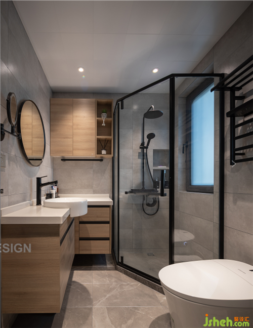 卫生间做了简单的干湿分离设计,整体铺贴灰色大理石瓷砖,干净卫生好打理。淋浴房内做了壁龛设计,可以把洗浴用品尽收于内,洗漱时方便拿取。上海装修设计干区选用原木色浴柜,为整体严肃冰冷的空间带来自然温馨的感觉,柜体悬空设计可以防止不受潮湿的影响,也为打扫卫生不留死角。