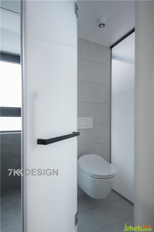 打开卫生间灯光。 卫生间使用渐变的雾化玻璃设计,上半节是透明,底下是完全雾化,打开开关时就完全变成雾化,完全看不见里面,里面也看不见外面,会保证一定隐私性。 没有人使用的时候上半节是透明的,这样这个卫生间的存在不会对于客厅和餐厅之间这个凸角不会太突兀空间看起来更完整,对于这样的客厅餐厅空间设计也是达到极致又非常有创意。 对于淋浴房浴室门打开之后,有一个过渡的区域中间玻璃做隔断方便换衣服,洗澡,也避免一进门就看到淋浴房也比较尴尬。采用现在流行的无地漏的像酒店一样的排水设计,非常干净整洁。