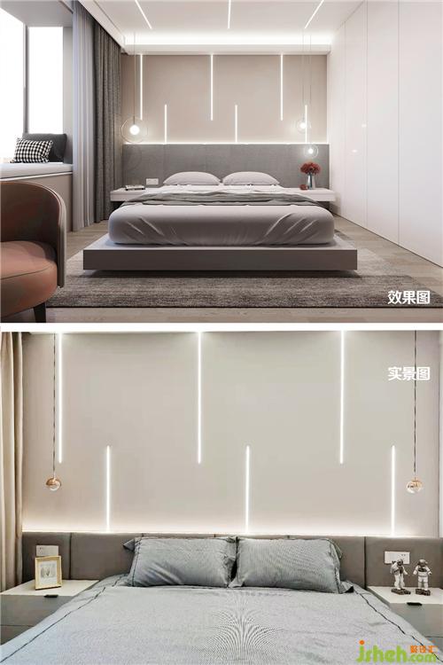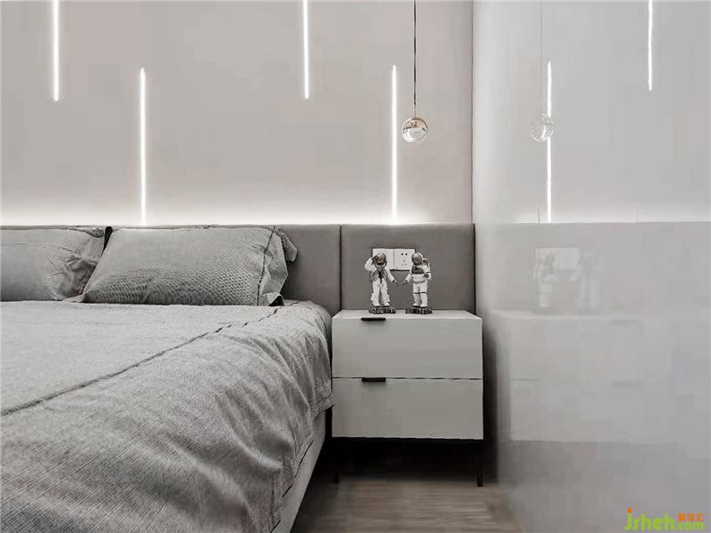 主卧的未来科技感也很强,实际上就是用灯带营造出来的设计感,而简单的设计更能突出未来的设计一切以极简主义为主。 主卧床头背景墙硬包材质与乳胶漆拼接和顶部都采用内嵌式灯带上海装修设计,一侧墙面采用白色亚克力,更加增加了光线的反射亮度,营造一种时尚炫酷科技感的睡眠环境。
