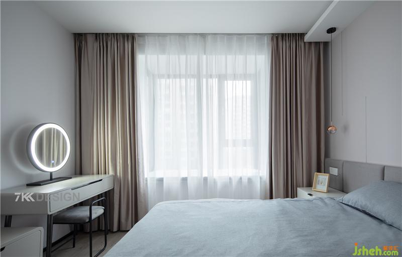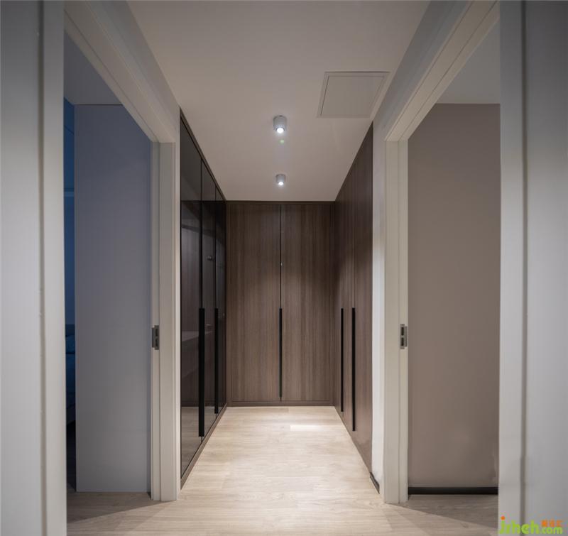 衣帽间是现在很多年轻人的追求,把两卧室中间墙打掉,做出一个U型衣帽间,有一个很大的储藏量,同时走在中间走廊也很宽敞,两卧室门对门,都使用了双开门,这样南北也比较通通风效果也很好。
