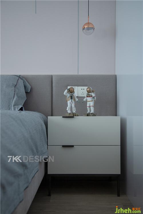 床头选择简约的床头柜增加收纳,上面摆放装饰品,让美观与实用并存。