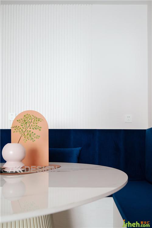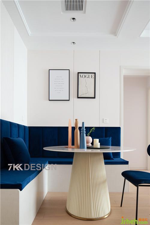 卡座的坐垫及后背选择了蓝色调,大理石白色桌面加乳白色支撑的圆形餐桌,搭配同样蓝色系的餐椅。因为家里有小孩,在餐桌餐椅及沙发等家具上都尽量选择了弧形的元素,能让空间减少直角的锋利感,弧线让空间感更柔软。