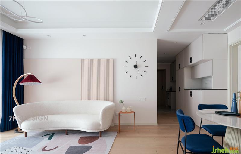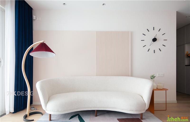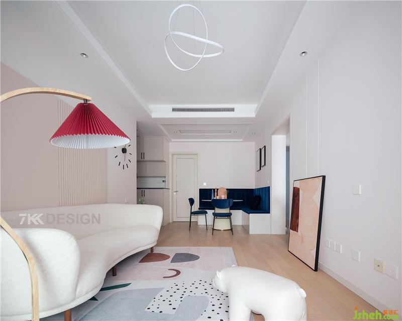 客厅整体延续餐厅白色的基底,粉色作为辅助色系,粉色是女业主比较喜欢的颜色,刚好孩子也是女儿,想打造清新浪漫的居家氛围。