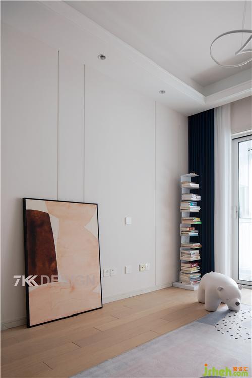 电视背景墙整体拆除采用石膏板造型,现在没有放电视柜,业主希望营造干净的氛围,留给孩子更多的玩耍空间,也不希望孩子从小养成看电视的习惯。暂时只用一副落地的可移动的装饰画点缀,使得整体客厅很有艺术感。