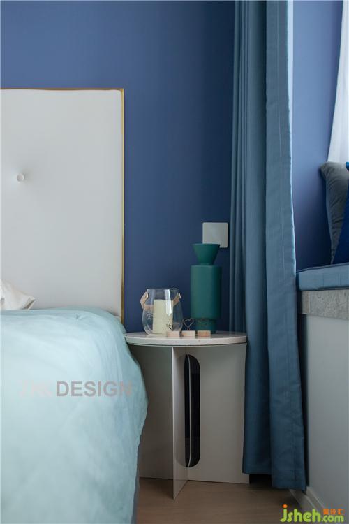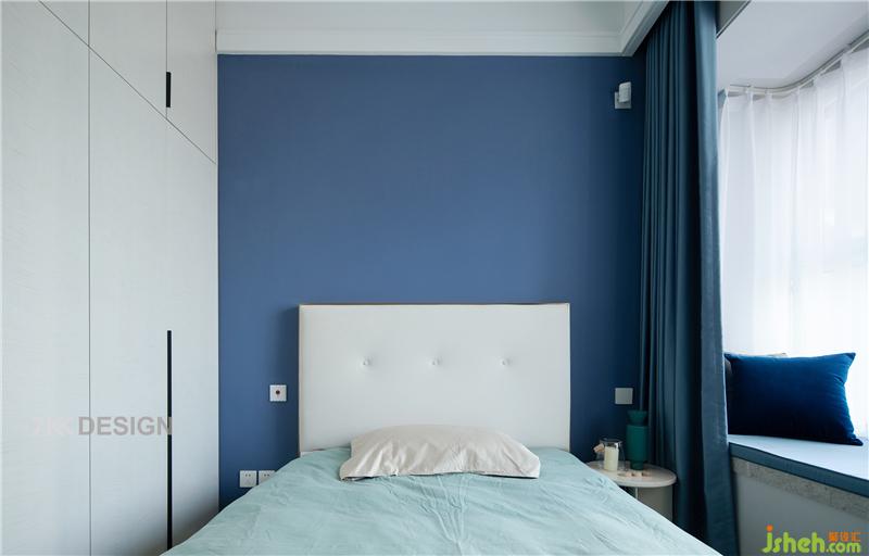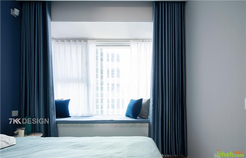 飘窗外侧是一层白色的窗纱,内部是厚实的蓝色窗帘,白天一层窗纱光线透过窗纱演绎空灵舒适的氛围,夜晚拉上蓝色的窗帘,享受安详静谧的睡眠时间。