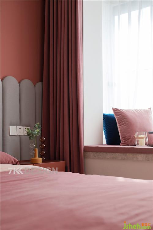 主卧改造前后对比:主卧将原始的硬包背景墙拆除,采用乳胶漆和拱形软包拼接的造型相接合,上海室内设计师整体以红色系为主营造浪漫的睡眠空间。