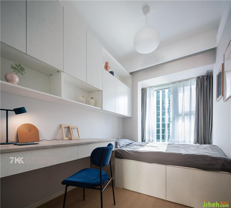 平时业主会在家办公,最小的房间作为书房使用并兼具收纳的功能,设计成榻榻米多功能房间。定制的榻榻米考虑到飘窗的高度,尺寸定制了500mm,和飘窗齐平,集床头柜和书柜于一体,将空间利用率最大化上海室内设计师。