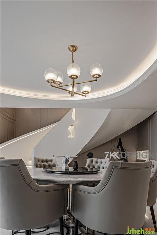 生活中的仪式感,从优雅地用餐开始,餐厅整体色调都以浅色系为基调。餐厅餐桌选择圆形桌子搭配,与圆弧吊顶相呼应,吊顶旁边的的圆柱包起来,整体风格打造欧式轻奢带点时尚的元素。