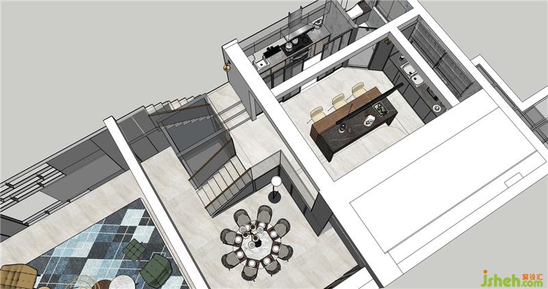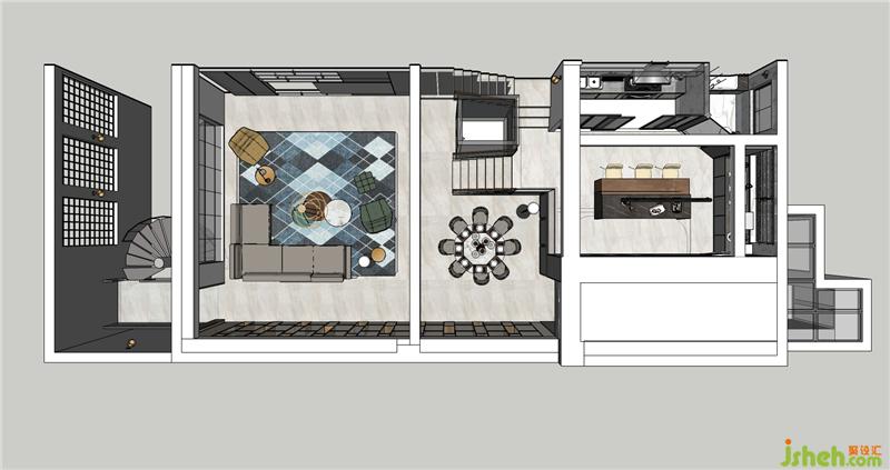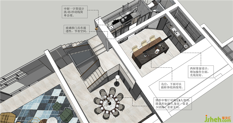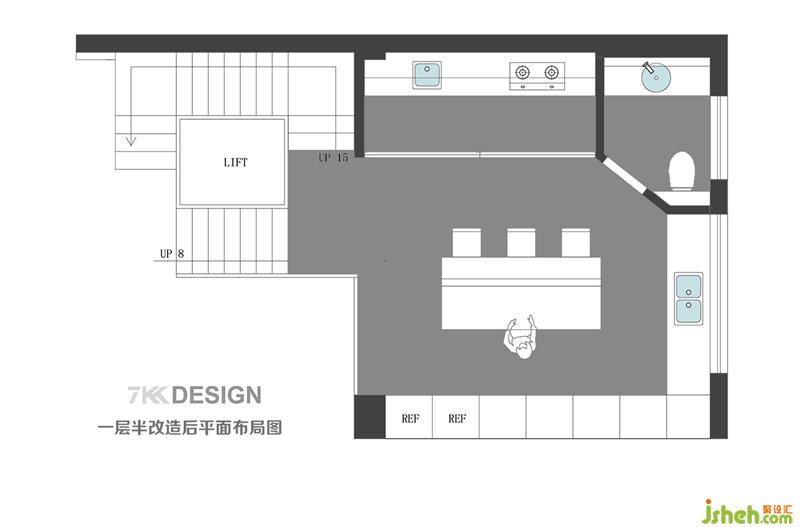 (一层和二层)夹层改造后平面布局图 夹层出去楼梯使用面积有25㎡ 1、把一层到夹层的楼梯位置改到和电梯一侧后,使得夹层和一层的互动更近距离,大人在楼上做事情可以随时看到孩子在楼下的动向。 2、中厨一字型设计,采用移门更节省空间。原始餐厅空间设计成西厨加岛台功能。一侧定制到顶的高柜,容纳设备柜和更多的储物功能。 3、缩小原始中厨的面积,靠窗腾出的空间设计卫生间,保留马桶和台盆的功能。卫生间门一侧斜角处理,为了容纳马桶的空间,让卫生间使用更宽敞舒适。