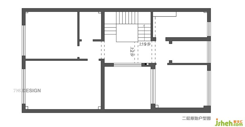 二楼原始户型图 二楼的错层结构使得走廊空间很有仪式感,二楼主要作为休息区域,书房功能,衣帽间功能使用。楼梯一侧的空间原本是外面的露台空间,到三楼都是镂空的,为了增加使用面积,重新搭建。这样二楼和三楼都多出一块使用面积。