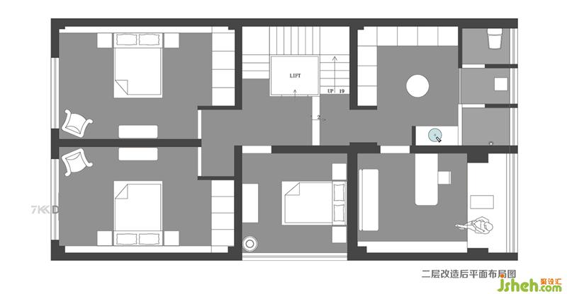 二楼改造后平面布局图 二层使用面积有90㎡ 1、电梯两侧是上下楼梯的位置,朝南的两间卧室一间为父母房,一间作为女儿房。中间搭建的房间作为客房使用。 2、错层上来北边的空间,一间作为多功能书房,另外一边是衣帽间,卫生间三分离设计,台盆外置和衣帽间同一空间,马桶和淋浴空间都靠窗设计,达到很好的通风效果。