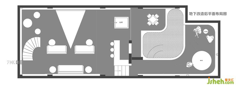 地下室改造后平面布局图 地下室使用面积有145㎡ 地下室把原始楼梯改到南边一侧和一楼挑空设计,为地下室引入更多自然光线,达到更好的通风效果,地下室主要功能为影音室和儿童游乐园,为儿童打造梦幻天地。