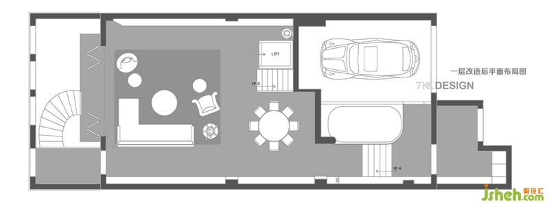 一层改造后平面布局图 由于这套房子的承重都在四周,内部的一些墙体都可以拆除重建,为改变格局埋下了很好的基础,使得方案得到很好的呈现。一层使用面积有137㎡。 设计师原本想把车库和客厅打通,这样一层的空间就会变得更宽敞,使用率更高,但是业主要求保留车库空间,设计师还是觉得挺遗憾的。 1、从入户门进来,把原始的卫生间空间拆除改到别的区域,腾出来的空间同时借用部分车库空间,打造儿童游乐区直通地下室,四周采用弧形玻璃,这样从进户门回家就可以看到小孩子玩耍的情况。 原本弧形玻璃设计师预留一扇玻璃门通到一楼,业主最后装修时没有采用,怕小孩子从地下室玩耍出来再到一楼,整个空间都会成为小孩的游乐空间,怕场面难以控制,只好封闭,让地下室成为小孩子的纯娱乐空间。设计师也是举得很遗憾。 2、改变原始的楼梯位置,从客厅一侧南北走向设置楼梯的位置,并留出电梯的空间。从楼梯走向一楼到二楼夹层的餐厨空间,从客厅南面预留楼梯通往地下室,同时设计挑空为地下室引入更多的自然光,达到更好的通风效果。 3、改变楼梯的位置楼,原始楼梯剩余的空间摆放中餐厅,夹层餐厨空间得到更多的释放。开放式的客餐厅一体,大人在吃饭的同时可以看到小孩在客厅玩耍,随时关注孩子的动线。楼梯的改变让空间达到更好的视觉效果,更宽敞。 4、原始墙面的承重柱结合造型包裹起来,营造完整的更好的视觉效果。
