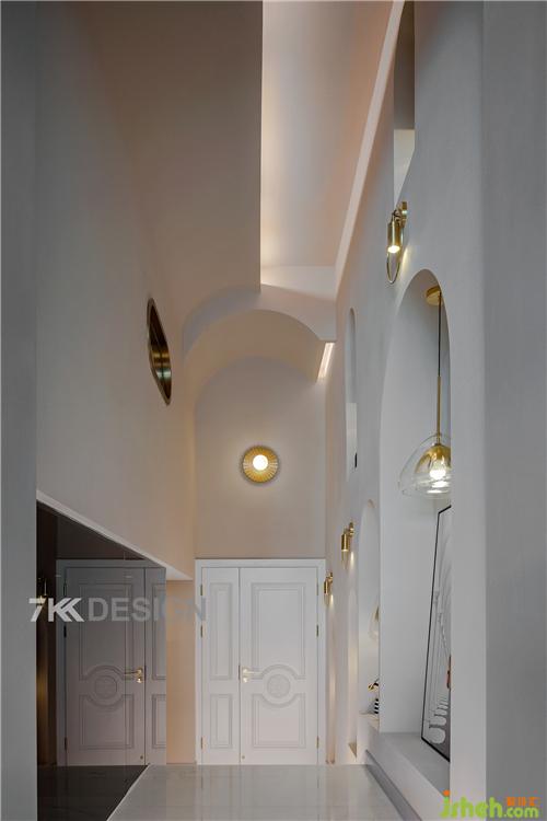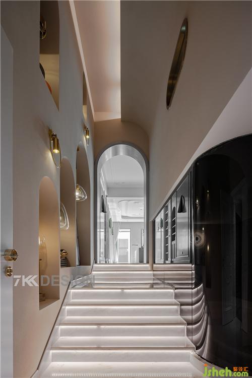 从台阶上来还有着3m的高度,其中拱形造型的应用让空间在视觉上显得更高,呈现柔和优美的曲线和弧度。进门顶部的弧形和到客厅的弧形造型相呼应,与客厅之间起到空间上的隔断和过度。从进门可以看到很多金属元素的应用,点缀出不一样的轻奢感。 左边弧形玻璃上面我们看到金属边框的造型,从夹层可以看到它的惊艳之处,透过玻璃可以看到楼梯走廊空间的动向。
