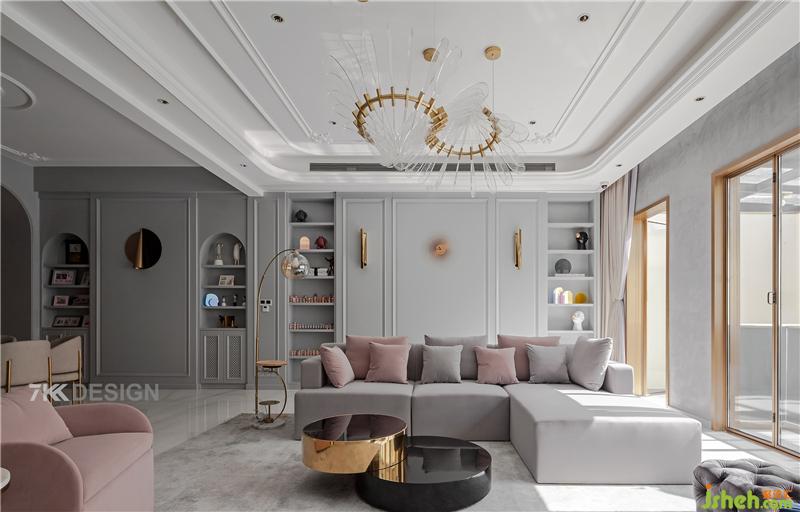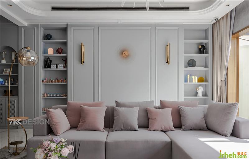客厅进来,整个墙面延续之前的拱形门造型与层板结合,上面摆放精致的装饰品,美观与实用并存。客厅白色与灰色为基调,金属元素点缀。软装上搭配粉色系,打破客厅的清冷与单调。顶部不同区域的吊顶处理使得空间层次感更加丰富。午后的阳光透过大面积的玻璃窗照泻进来,很明媚的感觉。